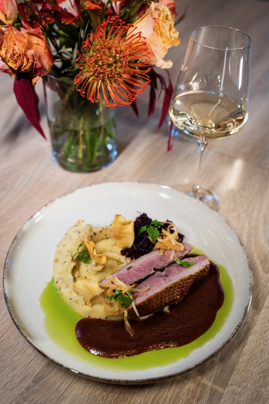 Danie główne – pierś z gęsi z puree ziemniaczanym z musztardą francuską, marynowaną pigwą, sosem żurawinowym i modrą kapustą z suszoną śliwką