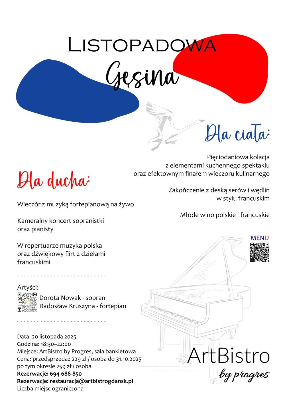 Zapraszamy na wyjątkowy wieczór, który połączy muzykę, smak i atmosferę w niepowtarzalnej odsłonie. W eleganckiej sali bankietowej ArtBistro by Progres odbędzie się kameralny koncert sopranistki i pianisty, w którego repertuarze znajdą się utwory polskie oraz subtelny flirt z francuskimi dziełami.